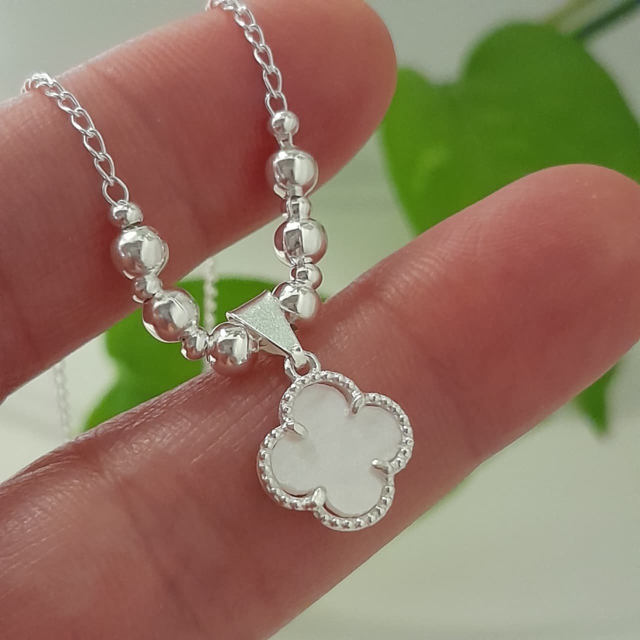Conjunto cadena con bolitas degrade y dije trébol blanco – Laminados