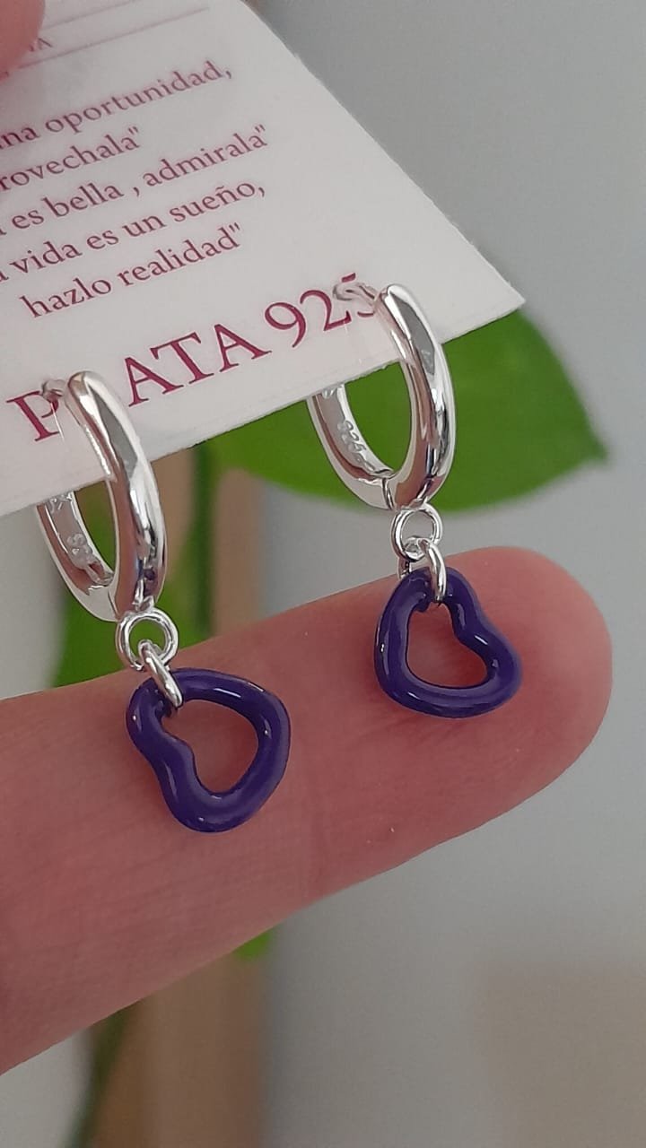 Aros cierre huggies argollas con corazon colgante azul – Plata 925