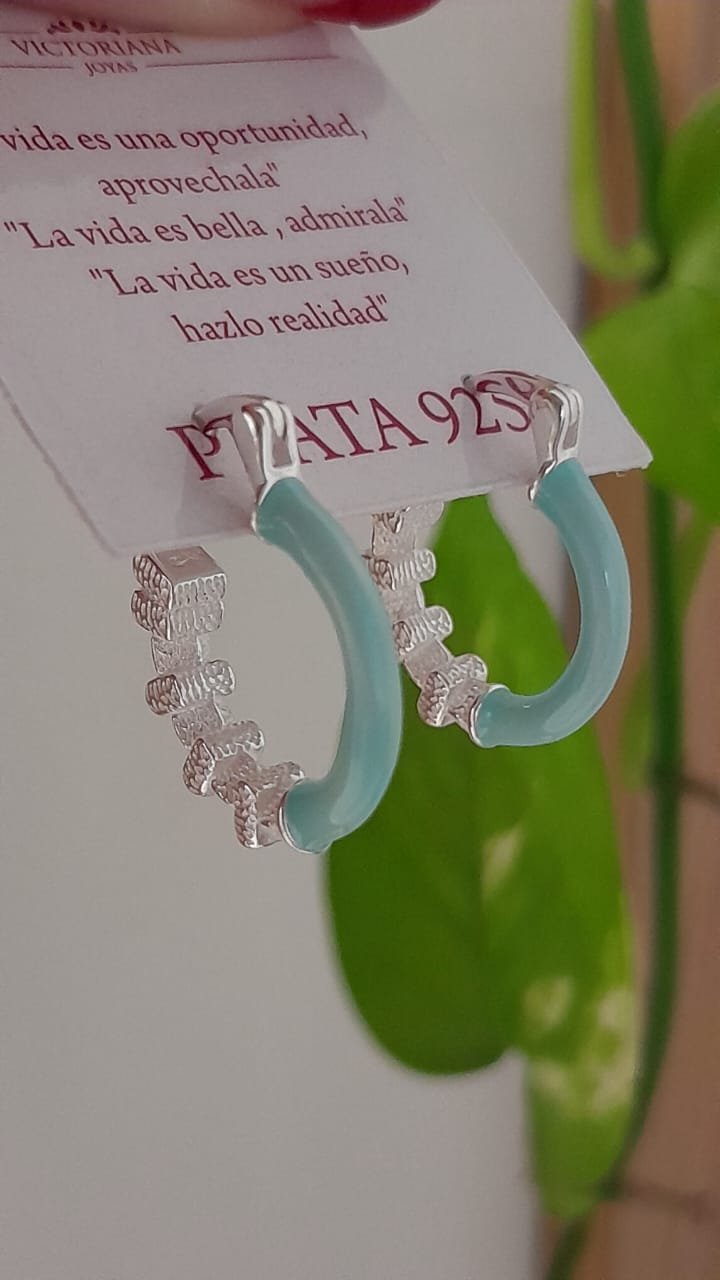 Aros cierre huggies con esmalte celeste y textura – Plata 925