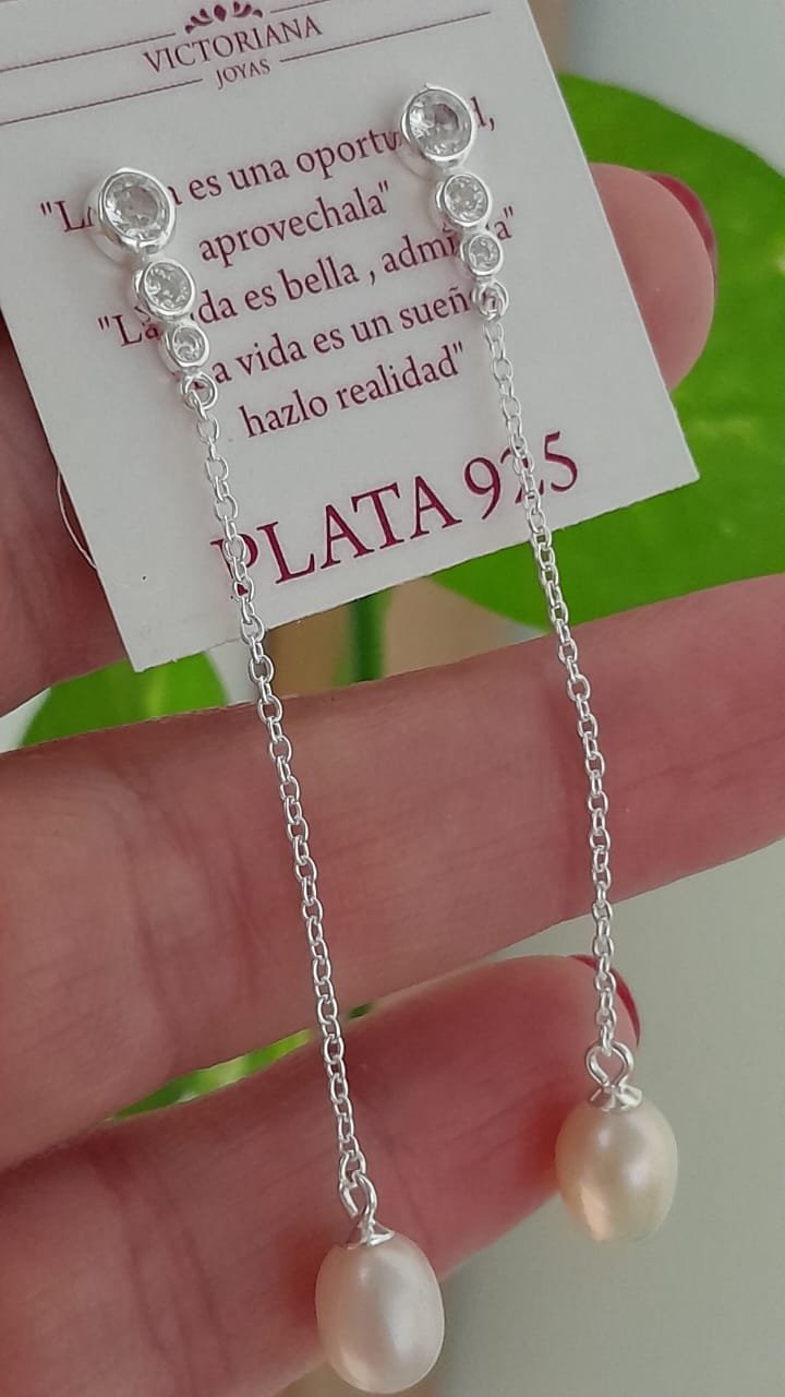 Aros pasante diseño colgante con cadena y perla – Plata 925